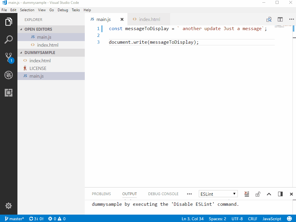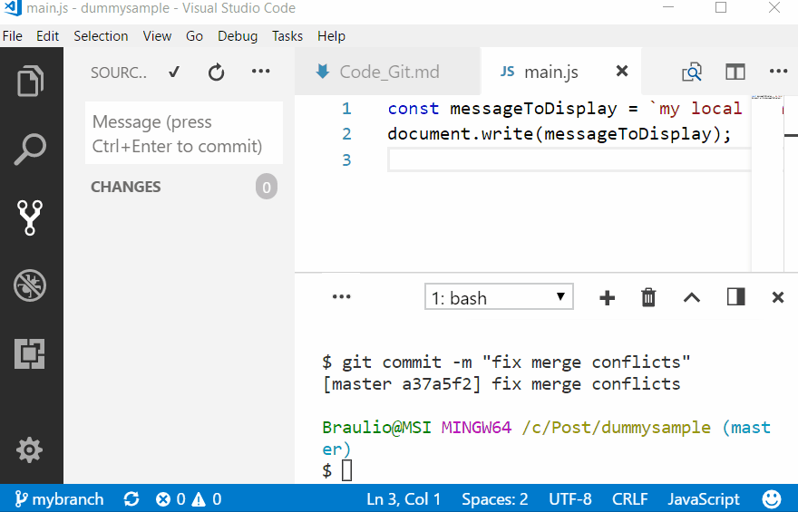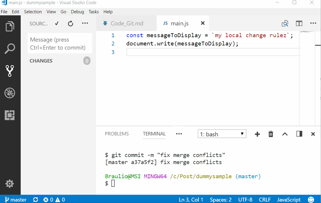 En este caso hemos puesto un conflico en el fichero main.js, tenemos que decidir con que cambio nos quedamos. Para ello: